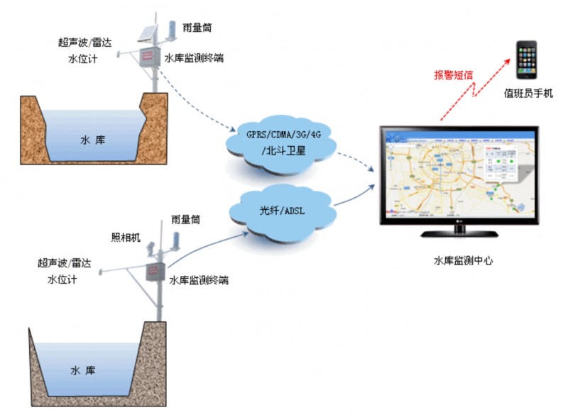水雨情自動監(jiān)測系統(tǒng)主要實現(xiàn)水情、雨情全過程的遠程自動采集、拍照監(jiān)視,實時記錄河道、水庫、渠道水位的動態(tài)變化過程。系統(tǒng)根據(jù)監(jiān)測水位及警戒水位、汛限水位,時段降雨量、日累計降雨量實現(xiàn)聲音、顏色、短信的防汛排洪預警功能。
