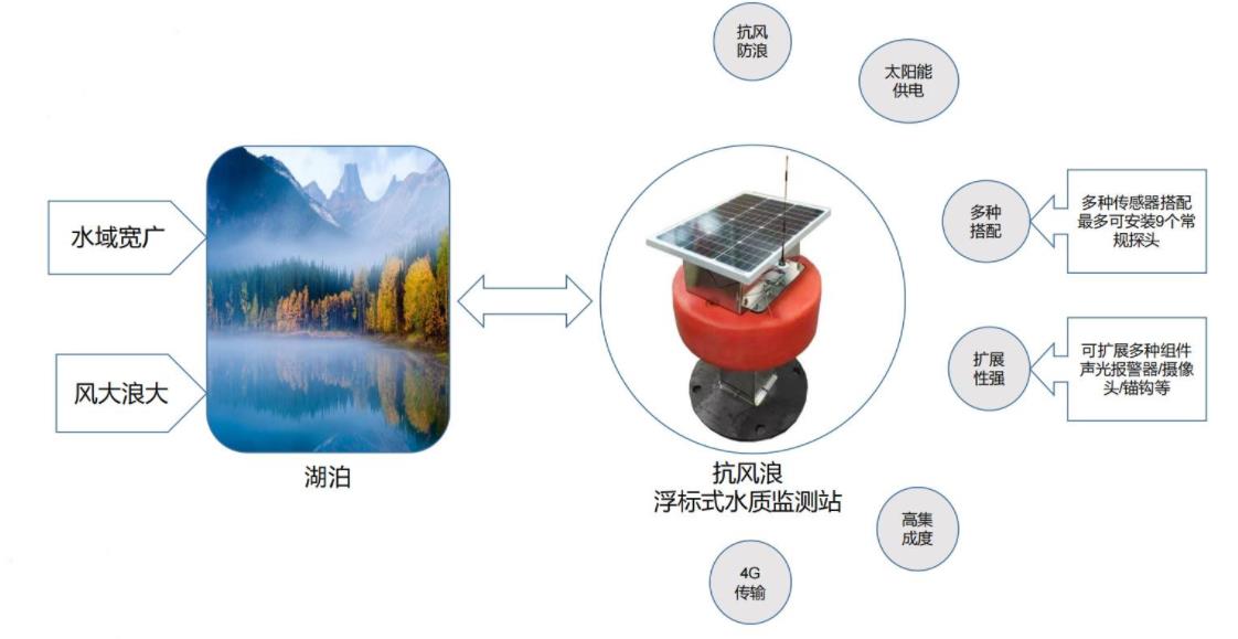 江河、湖泊、水庫等,是水的主要源頭,也是污染物的主要入口,水質(zhì)監(jiān)測尤為重要。但此類場景復雜多變,水質(zhì)狀況難以把控,污染程度存在區(qū)域性變化,且系統(tǒng)安裝環(huán)境更為復雜惡劣。需要多種類型的系統(tǒng)根據(jù)環(huán)境情況進行布點搭建。